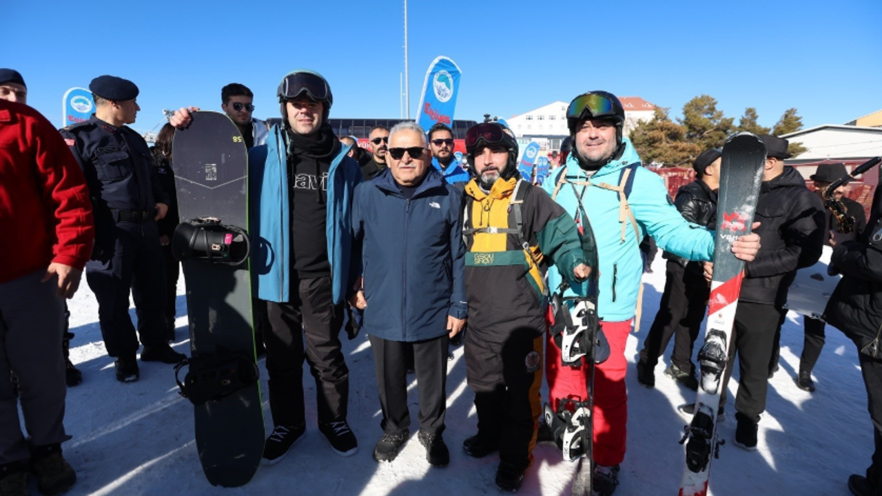 Erciyes Kayak Sezonu açılışında Başkan Büyükkılıç, ziyaretçilerle fotoğraf çekinerek sohbet etti.