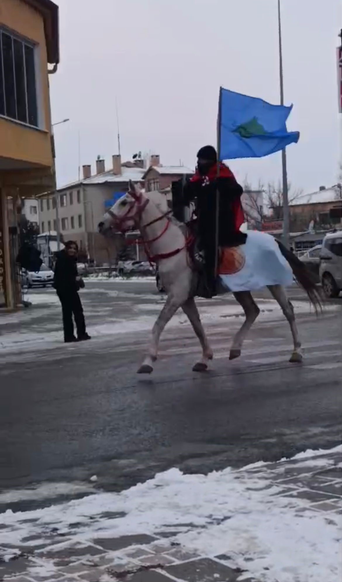 Kayseri’nin Tomarza ilçesinde bir esnaf, at üstünde sırtına astığı Türk bayrağı ve elinde Göktürk bayrağı ile tur attı.