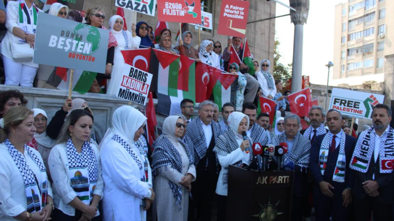 Bugün 81 ilde kurduğumuz bu zincir, Gazze’de evlatlarını kaybeden anne-babaların zinciridir. Öksüz, yetim bırakılan çocukların zinciridir, ve insanlığını kaybetmeyen herkesin zinciridir. Biz; 'Yaralıları mı kurtaracaktım, şehitleri mi taşıyacaktım ya da bir torba un mu bulmaya çalışacaktım? Yemin ederim eve tek bir torba un getirip, çocuklarımın karnının doyacağını bilsem, ölüme razı olurum' diyen Gazzeli annenin sesi olmak için, bu sesi dünyaya duyurmak için buradayız. Bu zulmü görmezden gelen herkese soruyorum; kalbiniz nerede? Yüce Rabbimiz mealen 'Bir insanı öldüren, bütün insanlığı öldürmüş gibidir. Bir canı yaşatan, bütün insanlığı yaşatmış gibidir' buyuruyor. Gazze; bu ilahi kelamın sarsıcı bir imtihanıdır. Bizler İstanbul’dan, Hakkari’den, Trabzon’dan, Erzurum’dan ve Türkiye’nin 81 ilinden dünyanın dört bir yanındaki kadınlara, kız kardeşlerimize sesleniyoruz: Barış kadınla mümkün. Barışçıl bir şekilde yola çıkan ve uluslararası sularda haydut İsrail’in hukuksuz müdahalesine uğrayan Küresel Sumud Filosu’nu dünya öylece seyretti. Hamdolsun Türkiye; Cumhurbaşkanımız Recep Tayyip Erdoğan’ın kararlılığıyla bu adaletsizlik karşısında da sessiz kalmadı. Sadece kendi ülkesinin vatandaşlarını değil, 13 ülkeden 101 vicdan sahibi gönüllünün de ülkelerine güvenle dönmelerini sağladı. Bizler de ablukayı delmek ve insanlık onurunu korumak için mücadele eden kahramanların ülkemize dönüşlerinde oradaydık. Hepsinin dilinde aynı temenni vardı; 'Biz elimizden geleni yaptık, umarım Gazze’ye bir umut ışığı olabilmişizdir'. İşte bugün o umut sözleri de bu meydanda yankılanıyor. Biz bugün bütün kimliklerimizden sıyrılarak; sadece kadın kimliğimizle buradayız. Çünkü bu mesele ne dünyadaki rollerimizle, ne taşıdığımız unvanlarla, ne de sahip olduklarımızla ilgilidir, bu mesele insanlık meselesidir. Bugün Türkiye’den tüm dünyaya tek bir şey söylüyoruz; barış kadınla mümkündür" diye konuştu.