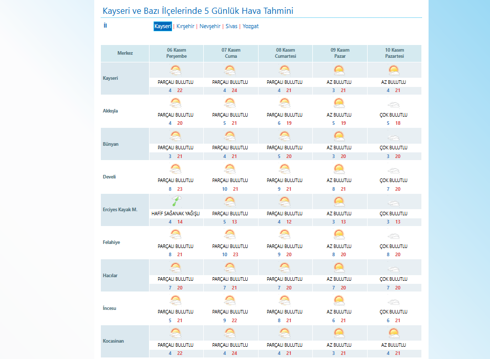 Kayseri ve ilçelerinde bu hafta hava parçalı bulutlu geçecek. Meteoroloji verilerine göre 6-10 Kasım tarihleri arasında kent genelinde yağış beklenmezken, sıcaklıklar mevsim normallerinin üzerinde seyredecek.
