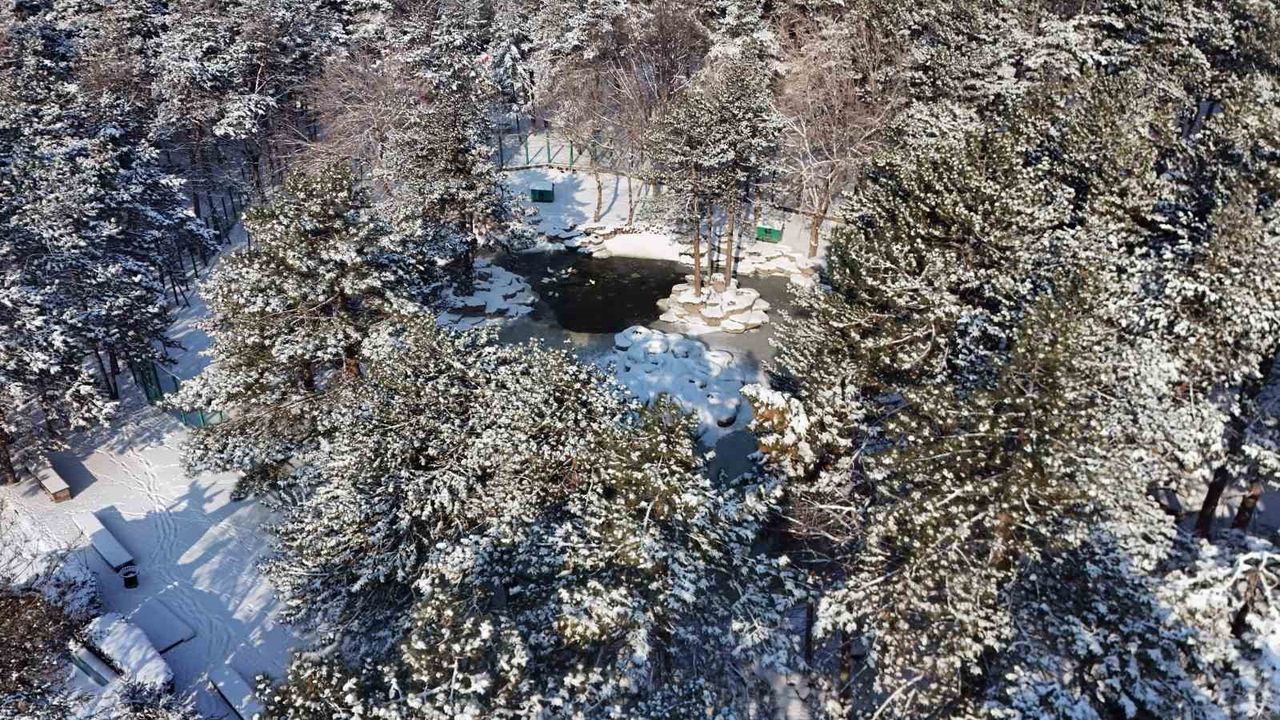 Beştepeler Mesire Alanı’ndaki doğal gölet, soğuk havadan nasibini alarak tamamen buz tuttu. Göletin üzerindeki kaz ve ördekler, karla kaplanan yeşil ağaçların arasında görüntülendi. Havadan yapılan çekimlerde, bu doğal tablo adeta bir kartpostal görünümü sundu.