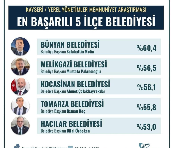 ORC Araştırma tarafından gerçekleştirilen Kayseri Yerel Yönetimler Memnuniyet Araştırması sonuçlandı. 3 bin 420 vatandaşın katılımıyla yapılan araştırmada Bünyan Belediyesi, yüzde 60,4 memnuniyet oranıyla Kayseri genelinde en başarılı ilçe belediyesi seçildi.
