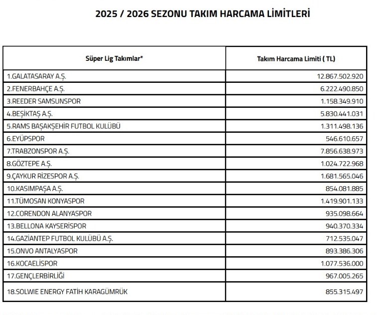 Türkiye Futbol Federasyonu (TFF) Süper Lig takımları için 2. transfer ve tescil dönemi harcama limitlerini açıkladı. TFF'nin resmi internet sitesinden yapılan açıklamada Kulüp Lisans Kurulu, 2025-2026 Sezonu Süper Lig Takım Harcama Limitleri’ni ikinci transfer ve tescil dönemi ile ilgili olarak belirlendiği belirtildi.