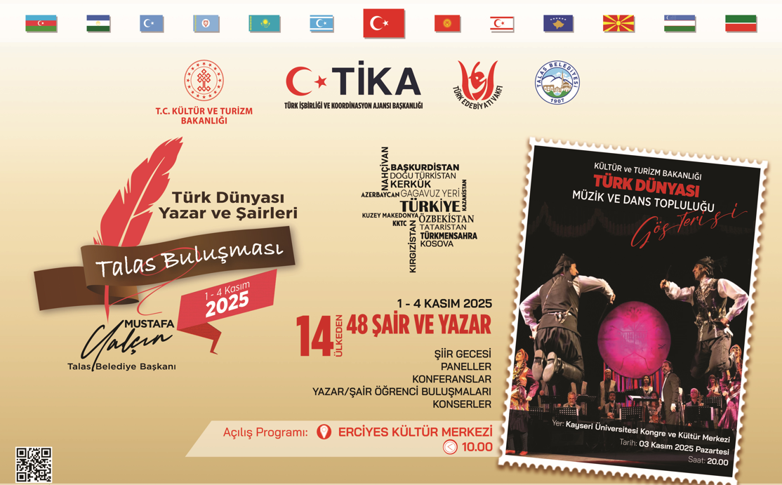 Talas Belediyesi'nin ev sahipliğinde gerçekleştirilecek 'Türk Dünyası Yazar ve Şairleri Talas Buluşması', 1-4 Kasım tarihlerinde 14 ülkeden 48 yazar ve şairi bir araya getirecek. Kültür ve Turizm Bakanlığı, TİKA ve Türk Edebiyatı Vakfı iş birliğiyle düzenlenecek etkinlik, kenti dört gün boyunca kültür, sanat ve kardeşlik atmosferine büründürecek. Talas Belediye Başkanı Mustafa Yalçın'ın vizyonuyla hayata geçirilen buluşma şiir geceleri, paneller, konferanslar, yazar ve şairlerin öğrencilerle buluşmaları ile konserlerden oluşan zengin bir program sunacak.