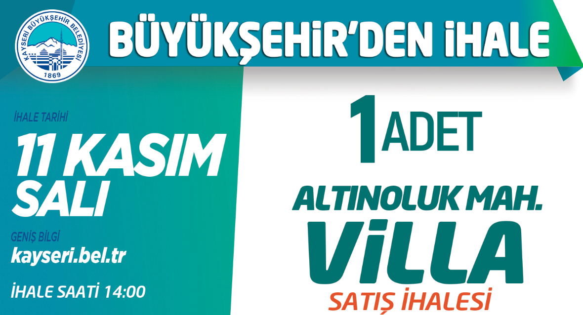 Büyükşehir Belediyesi’ne ait Melikgazi ilçesi Altınoluk Mahallesi'nde bulunan 1 adet villa, “Açık Teklif Usulü” ihale ile satılacak. Mülkiyeti Kayseri Büyükşehir Belediyesi'ne ait olan Melikgazi ilçesi Altınoluk Mahallesi'ndeki 1 adet villayı ihale ile satışa çıkarıyor. İhale, 11 Kasım 2025 Salı günü saat 14.00'te gerçekleştirilecek.